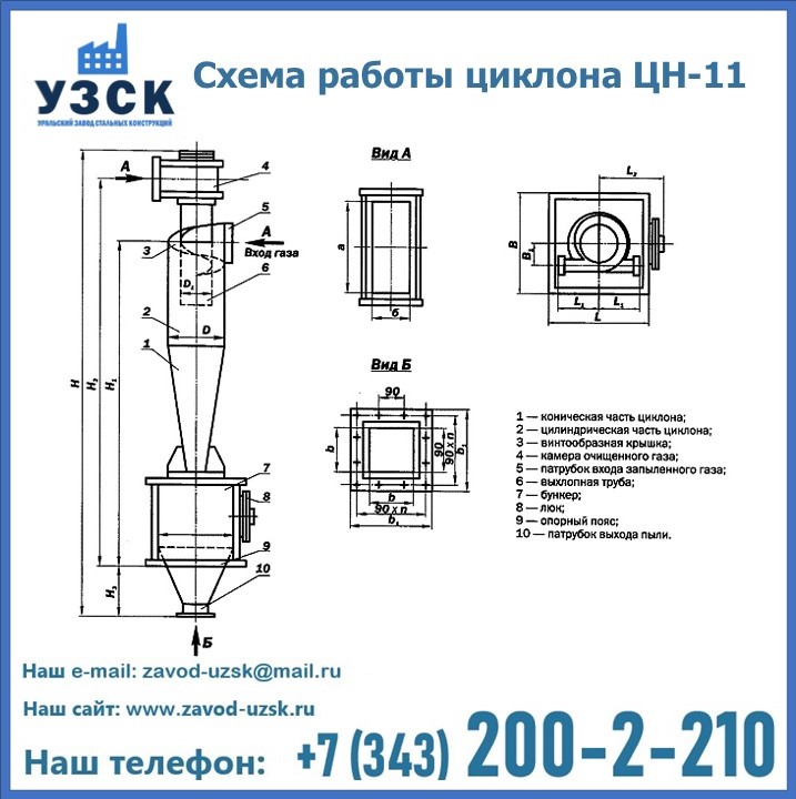 При этом ощутимой разницы в цене между универсальным и узконаправленным, подобранным в соответствии с конкретными техническими требованиями циклоном, нет. Стоимость воздухоочистительного оборудования типа циклон обусловлена маркой и толщиной стали, из которого он изготовлен, сложностью и специфичностью конструкции, наличием дополнительного оснащения (бункер, улитка и другие). При необходимости, на заводе УЗСК в Аксу будет изготовлен циклон по индивидуальным техническим чертежам заказчика.