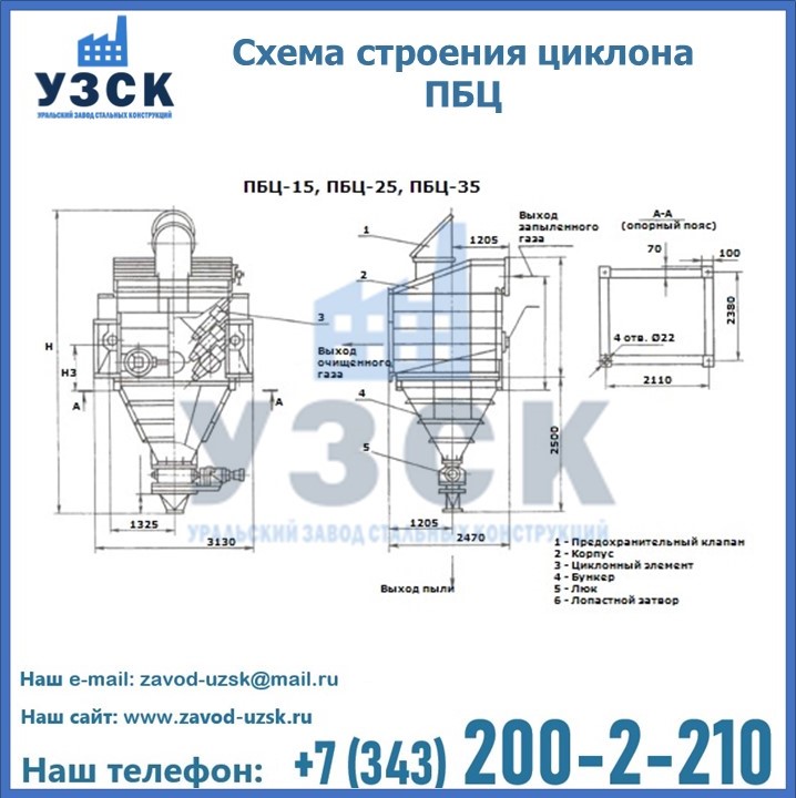 Завод «УЗСК» в Аксу предлагает приобрести циклоны ПБЦ и прочие устройства, полностью укомплектованные и готовые к эксплуатации. Мы гарантируем соответствие оборудования всем требованиям ГОСТ и ТУ, износостойкость и высокую производительность предлагаемого оборудования. Уральский Завод Стальных Конструкций изготавливает и продает надежное, эффективное и производительное оборудование, имеющее длительную гарантию и большой эксплуатационный ресурс. Если требуется изготовить циклон нестандартных размеров, то такой вариант выполнения заказа тоже предусмотрен, так как предприятие имеет собственные производственные площади и надежных поставщиков. На все поставляемое или производимое оборудование имеются чертежи и прочая техническая документация. Заказать и купить циклоны или прочее оборудование высокого качества и по доступной цене можно через наш сайт или по указанному в разделе «Контакты» телефону.